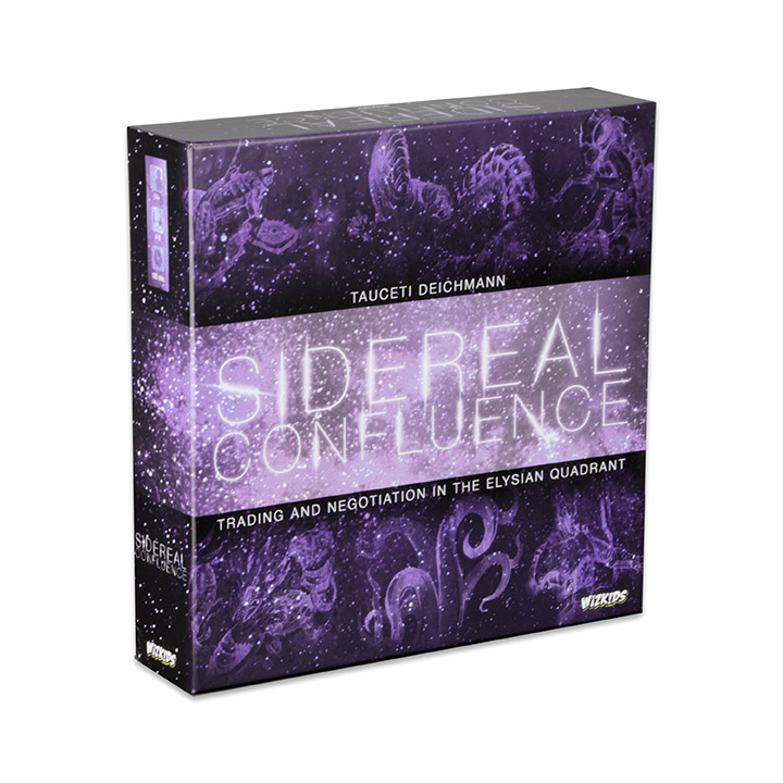 In Sidereal Confluence: Trading and Negotiation in the Elysian Quadrant, 4 – 9 players will need to competitively scheme and create mutually beneficial agreements to keep their economies thriving. Each player must choose one of the nine unique and asymmetrical alien races that have come together to form a trade federation in their quadrant. Over the course of the game, each race must trade and negotiate with the rest to acquire the resources necessary to fund their economy and allow it to produce goods for the next turn. As no race has the ability to thrive on its own, Sidereal Confluence has a uniquely cooperative feel and with almost all simultaneous action, the game play is always moving.