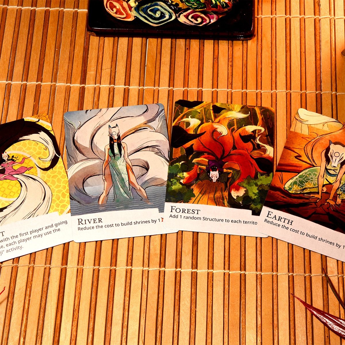 Jinja adds replayability with variable goals and events. Omikuji, or “fortunes,” are secret goals that score you bonus points if your shrines are on key locations. Kitsune cards are randomly chosen for each game, providing different discounts, bonuses, and abilities that change with the seasons.