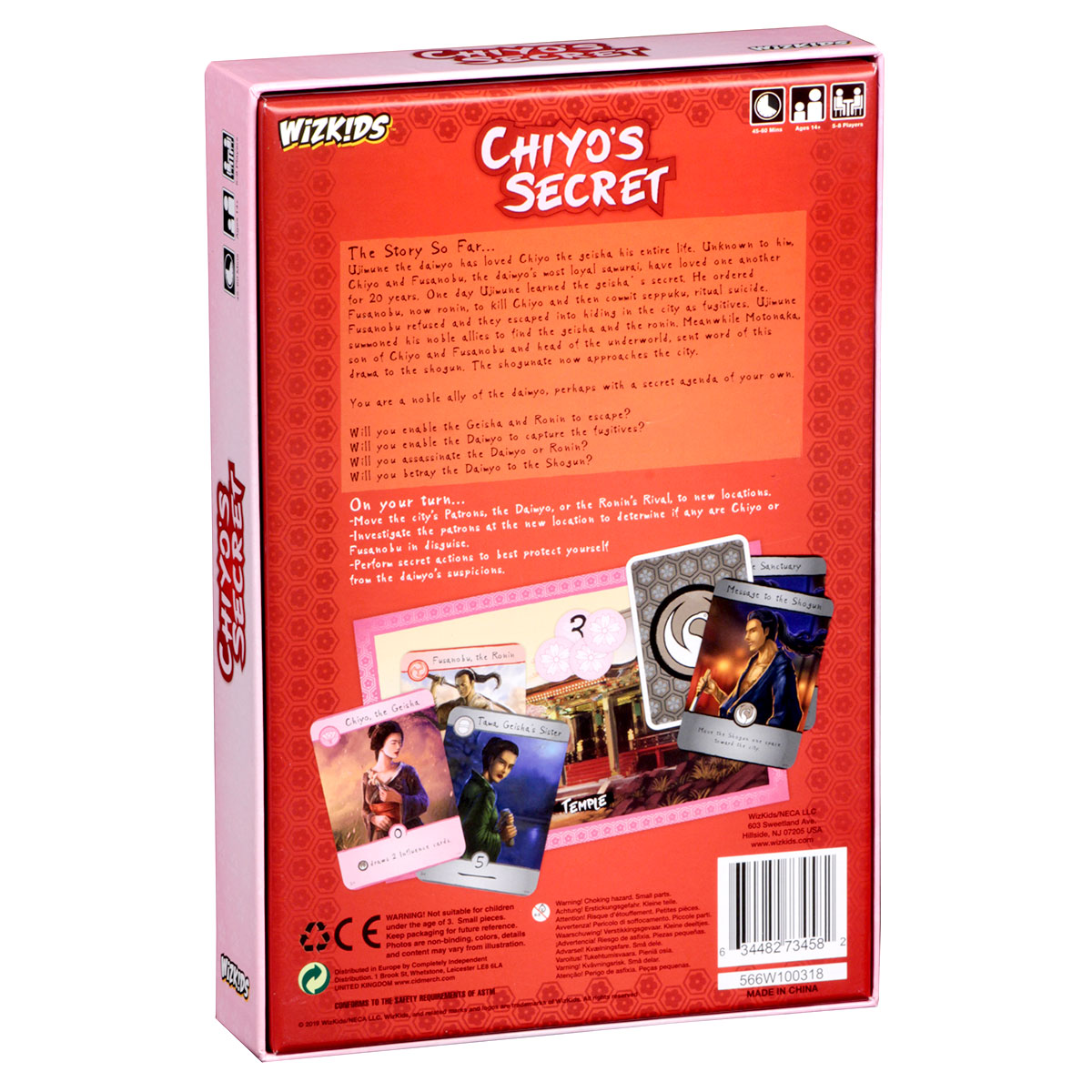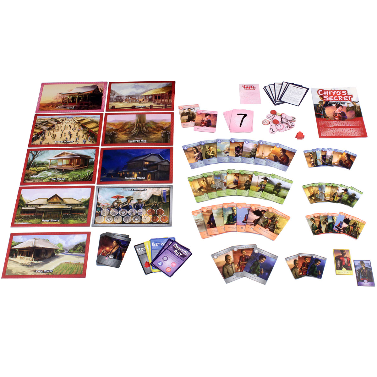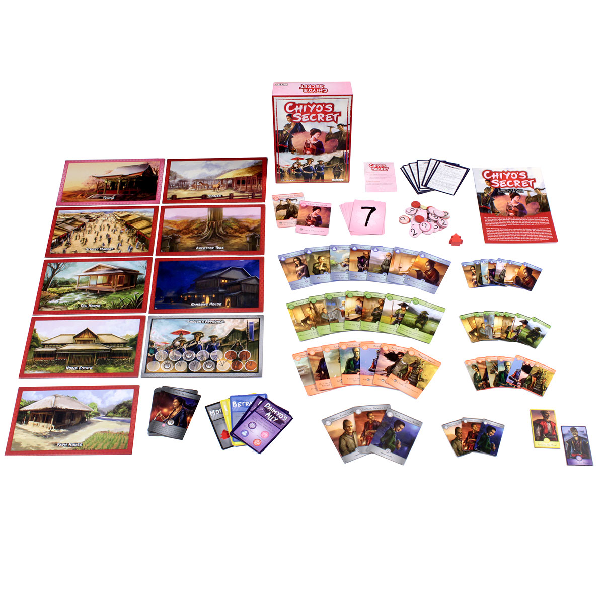 In this hidden role game taking place in feudal Japan, players decide the fate of a pair of star-crossed fugitive lovers, Chiyo and Fusanobu, at the climax of their epic love story. There are four teams: Loyal Allies, who seek to capture Chiyo and Fusanobu and send them to be executed for their crimes. Usurpers, who seek to lure Fusanobu and the Daimyo into a trap and seize power for themselves. Betrayers, who seek to betray the Daimyo and present Chiyo and Fusanobu to the Shogun instead. Finally, there is the lone Motonaka, the fugitives’ son, who seeks to protect his parents, hiding them until the Shogun arrives.