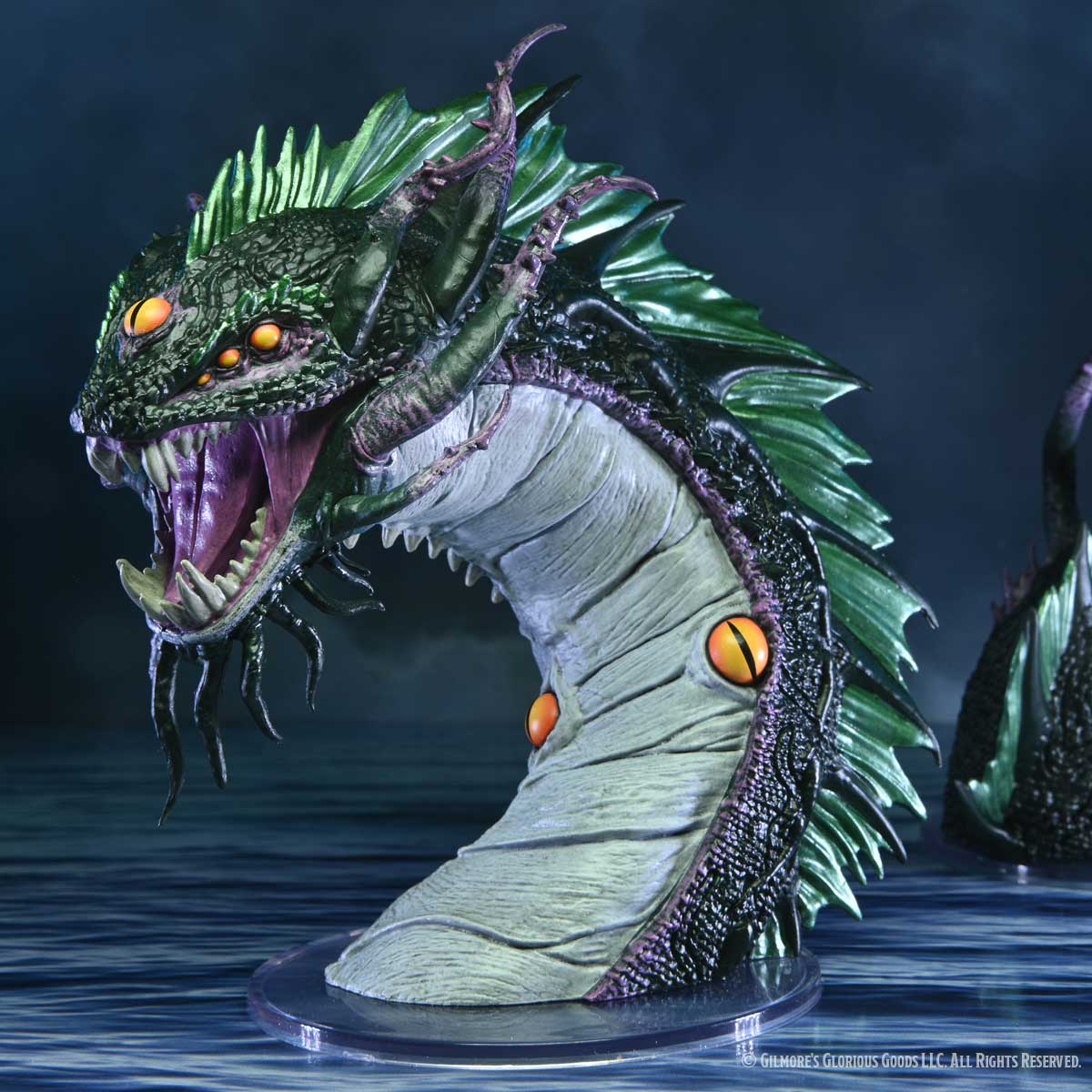 Fresh off its debut during the Mighty Nein Reunited special, Critical Role: Uk’otoa brings a version of the tabletop miniature directly to your collection! This gargantuan miniature features 3 pieces; head, midsection, and tail, all on their own bases that can be posed or positioned all over the battlefield as the rest of the impossibly long serpent coils beneath the waves. The head, bearing down on its prey, or rewarding those that set it free, stands nearly 5 inches tall. The massive tail curves out of the water, looking to drag someone below, and can hold 1 unlucky medium creature on a 25mm base.