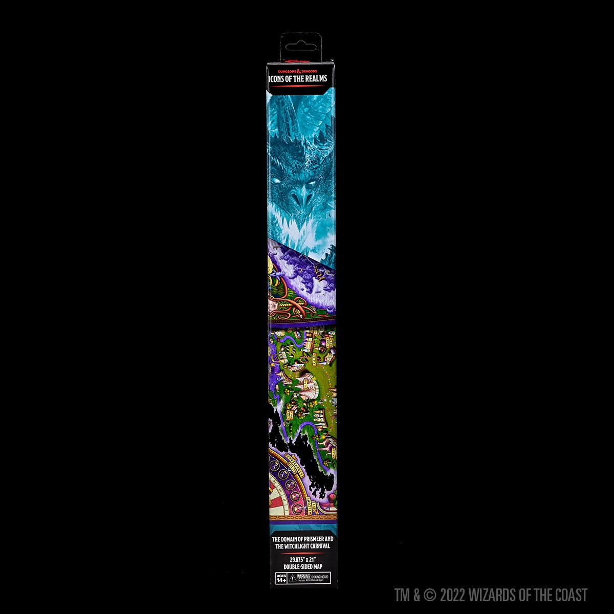 WizKids in collaboration with Wizards of the Coast bring to you the first in our line of D&D inspired maps. This double-sided full color map features The Domain of Prismeer on one side and The Witchlight Carnival on the other. Printed on high-quality, tear-free vinyl measuring 29.875 x 21 inches.