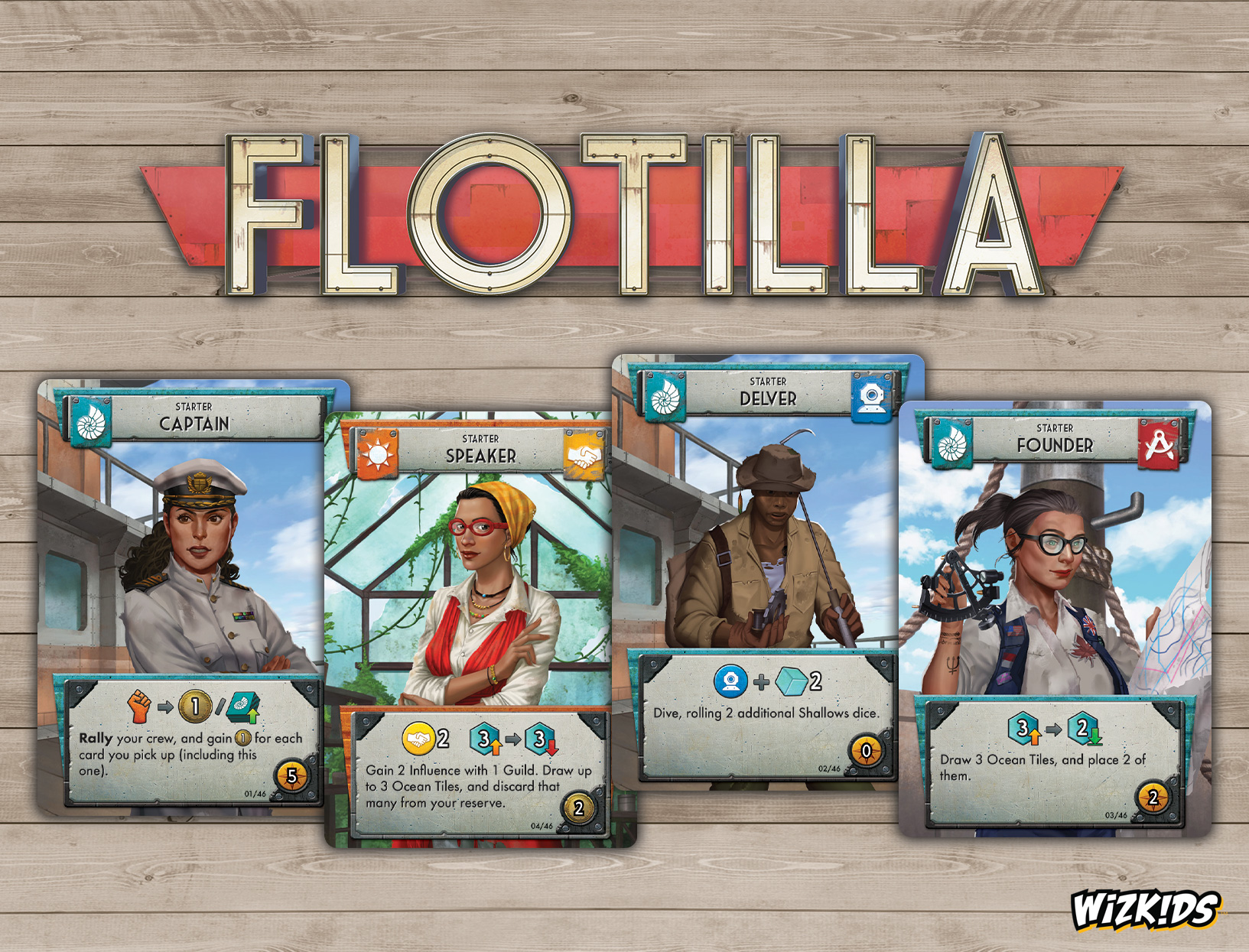 The choice of if or when to switch from a “Sinkside” explorer to a “Skyside” settler defines the very core experience of Flotilla. They represent two similar but distinct game experiences, utilizing the same game components, seamlessly intertwined among all players. If you switch, you’ll flip over all of your accumulated game components, watching your crew grow into new roles with new art for the same characters, while finding entirely new uses for your ocean tiles and resources, and beginning to trade with the “Sinkside” players as you go after new objectives. As players turn “Skyside,” different niches are filled, forever changing the game’s economy. Mastering this ebb and flow will be critical if you’re to shape the new face of humanity!