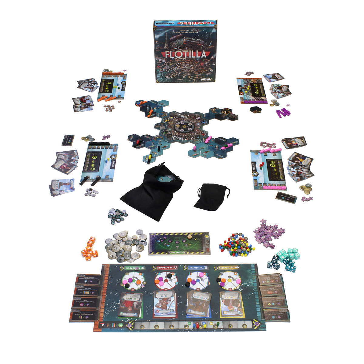 As a “Skysider,” you will use your resources to build an expansive network of watercraft and docks, using the “Skyside” of your ocean tiles. Your divers will also have new jobs as researchers, rolling custom, multicolor Research dice, to discover new technologies that allow the Flotilla to manage a growing population. You’ll also build Sonar stations, making life a little easier for the “Sinksiders” still out exploring the unknown, while earning quite a few points for yourself.