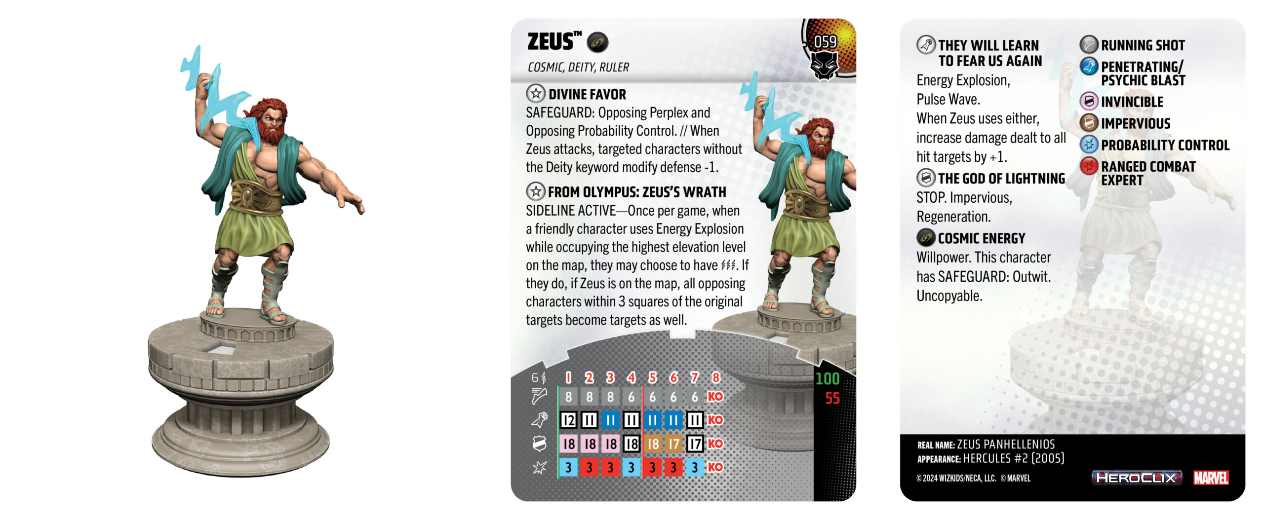 “From Olympus” was the answer to the Olympic gods. Each one cares about a certain power or action, augmenting it with a divine boost. For example, Zeus looks for characters using Energy Explosion. Once per game when any friendly character uses it, including Zeus, they may do so with three targets. If Zeus is on the map the boost goes further, exploding out to zap anyone within three squares of the original targets. With the Olympic gods able to supercharge their own actions, there is a meaningful decision point to them when team building. Do you sideline them for a small one-time boost? Or do you field them on the map to unfurl the full force of their divine glory?