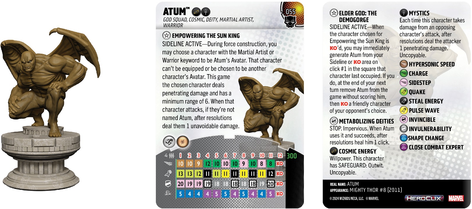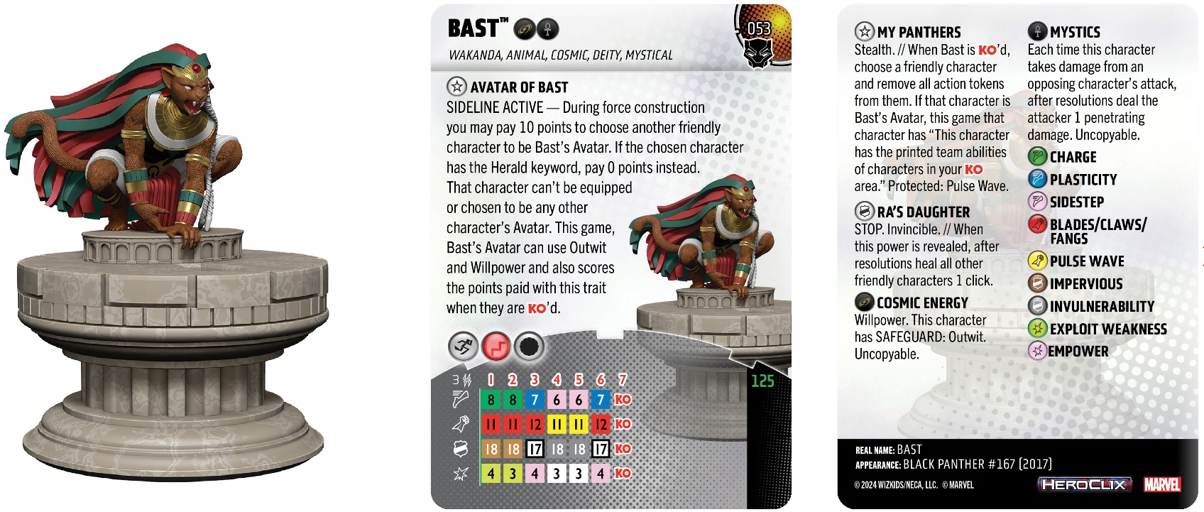 Last time we discussed how the design team brought Vibranium to HeroClix, and today we’re digging into one of Marvel HeroClix: Black Panther’s subthemes: Deities! Choosing subthemes for a HeroClix set can be a bit tricky; a good subtheme feels like it has some connection to the theme the set is named for, but is different enough to broaden the set’s appeal. For Black Panther, one of the persistent themes was how heroes related to the divine. Sometimes T’Challa was the avatar of Bast, at another point he was married to Storm, he’s fought alongside Thor, and more than once he’s had to fight a deity. With Bast’s inclusion in the set a shoo-in, it was easy to broaden the set’s focus to include some of Marvel’s other deities and their champions.