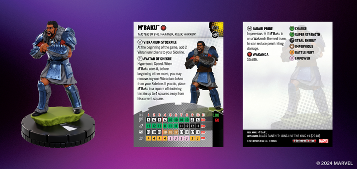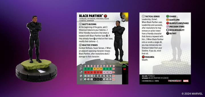 Leading the charge into this new age are four of Wakanda’s most famous inhabitants: The noble T’Challa. The brilliant Shuri. The fierce M’Baku. The cunning Killmonger. They’re all ready to crash into the fray at your next HeroClix game. In designing this group, we took some of our favorite concepts from the Marvel HeroClix: Black Panther set (like Vibranium tokens) and built upon them to bring you new and unique takes on these colorful characters. Let’s take a closer look at what these combatants bring to your team