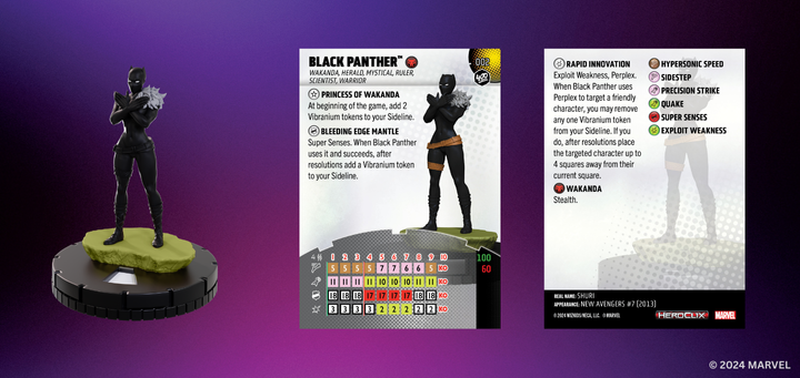 Available right away on her first four clicks, including the first click of her 60-point line, Shuri has the ‘Rapid Innovation’ special power: a potent combination of Exploit Weakness and Perplex. It gets better! When Shuri uses Perplex, remove a Vibranium token to add an impressive bit of mobility to any friendly character even herself! Whether she is placing friendly characters in position for maximum impact or using Quake and Exploit Weakness against a pack of opposing figures, you will not be disappointed with the utility offered by this member of the Wakanda royal family.
