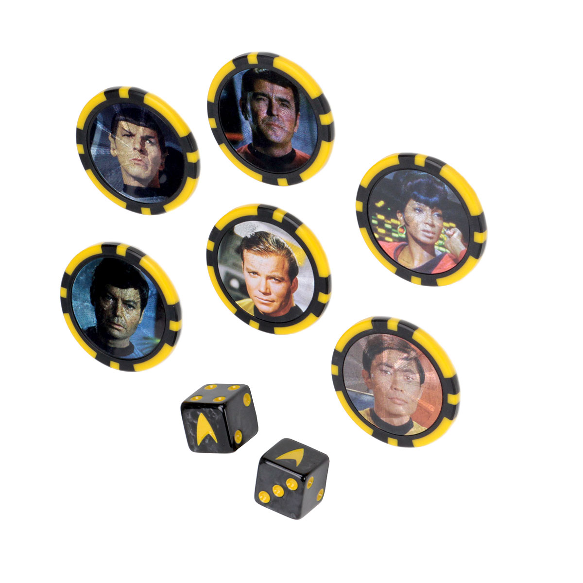 The Star Trek HeroClix Away Team: The Original Series Dice & Token Pack contains two (2) custom dice featuring the Starfleet icon and six (6) custom action tokens featuring images of the crew of the U.S.S. Enterprise.