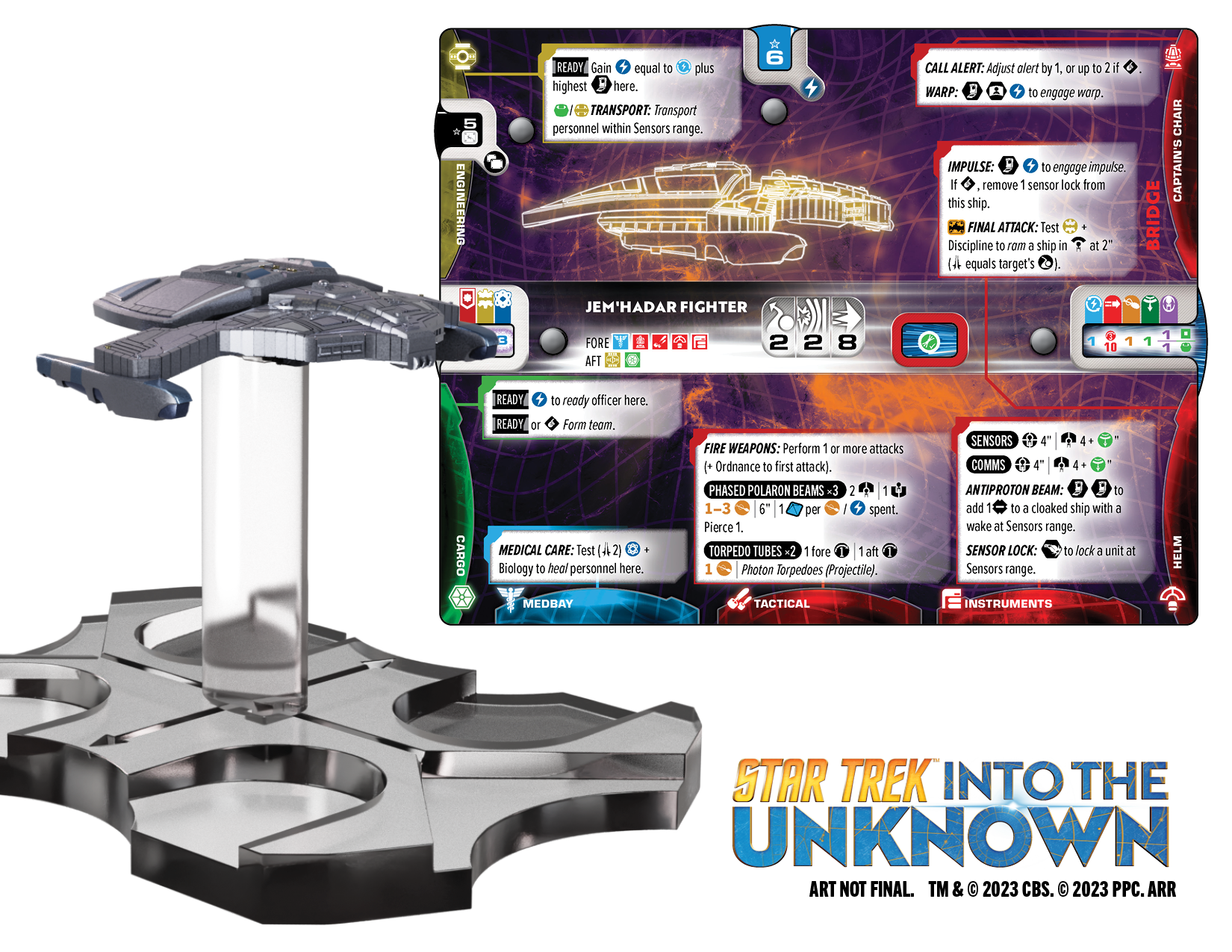 Star Trek: Into the Unknown is a tactical miniatures game for two players. Each player commands a fleet of starships from the galaxy’s major civilizations to compete in evolving, multi-part missions. Fleets maneuver, explore, and negotiate, but when conflict erupts, they must leverage every advantage to defeat their opponents in thrilling space combat!