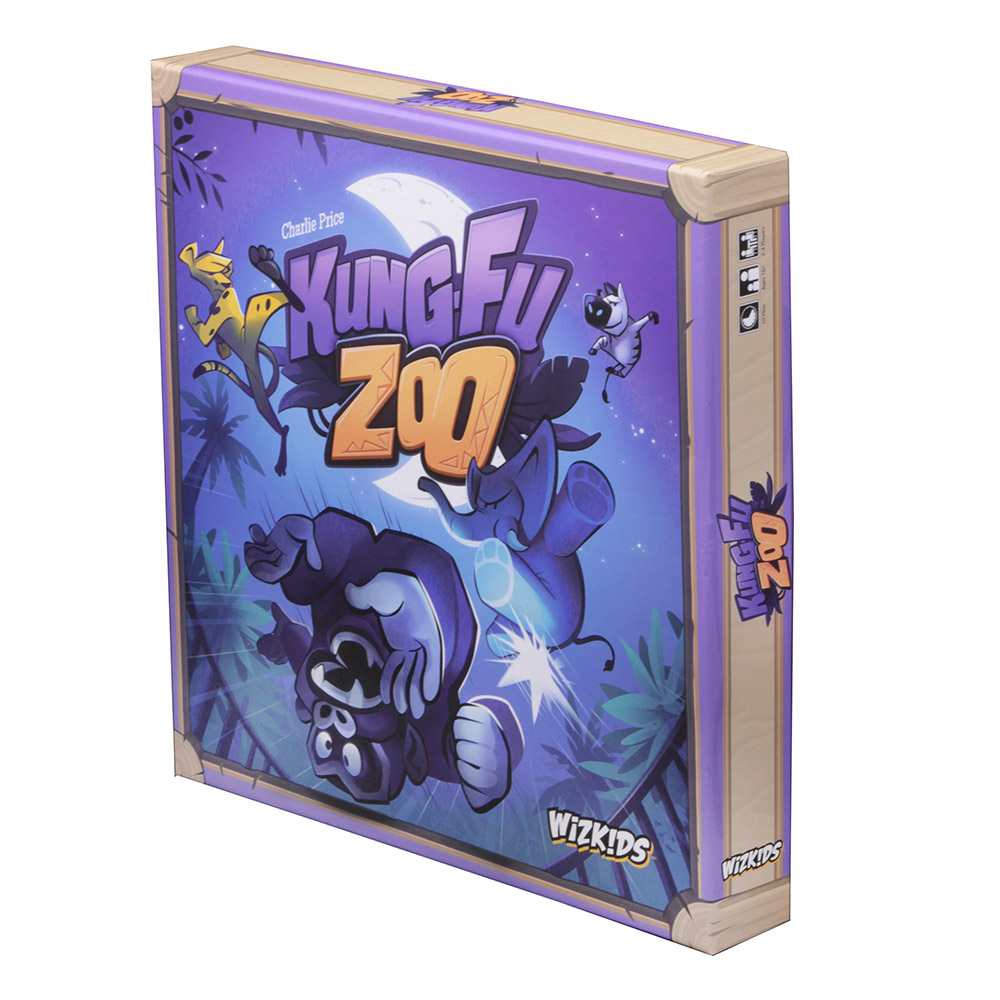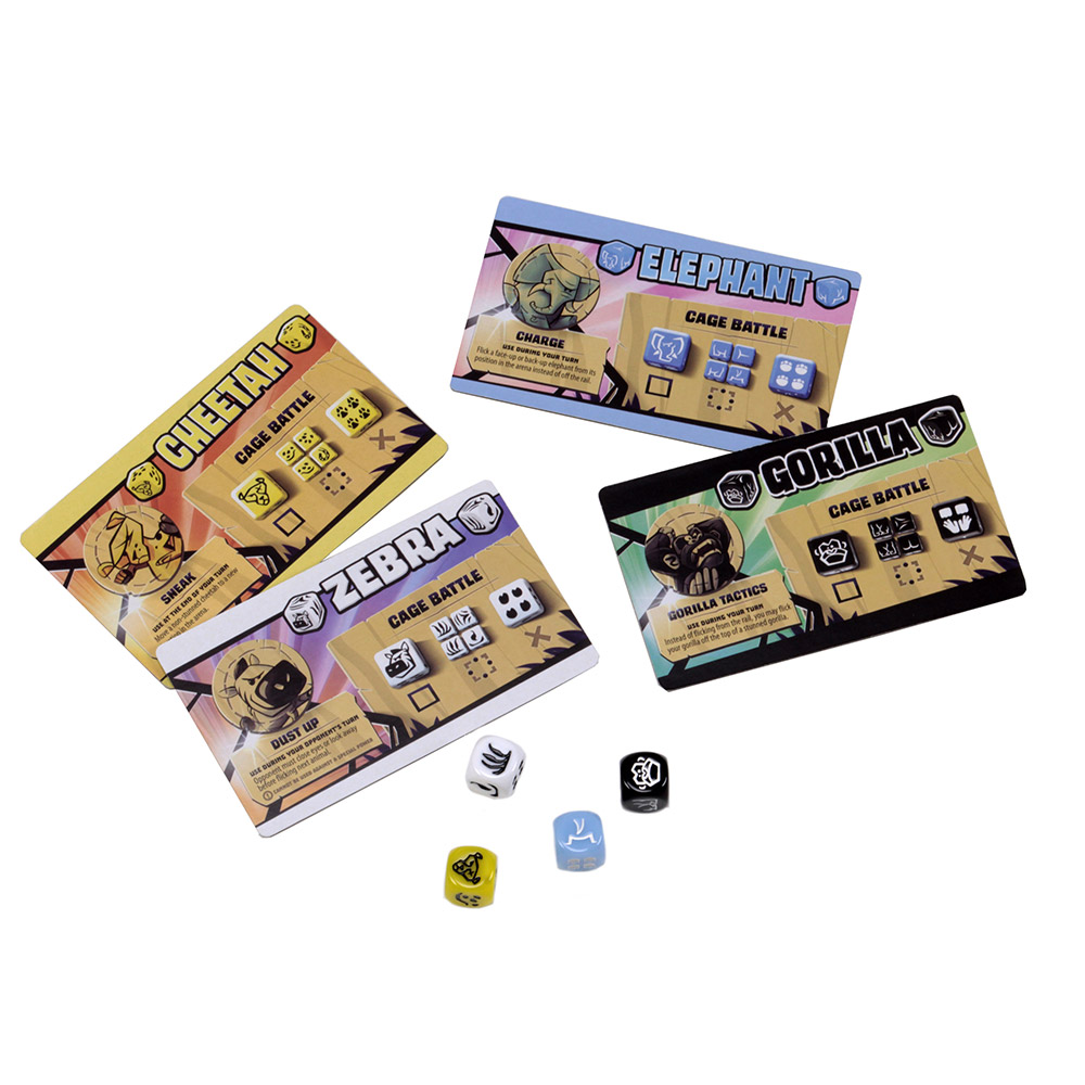 Welcome to Kung-Fu Zoo, a zany dice-flicking dexterity game for 2-4 players. You control a team of highly-trained animals—cheetahs, elephants, gorillas, or zebras—in a Kung Fu battle against your rivals. You win the game by knocking all of your opponent’s animals into cages or onto their backs. Who will be tonight’s champion of the zoo?