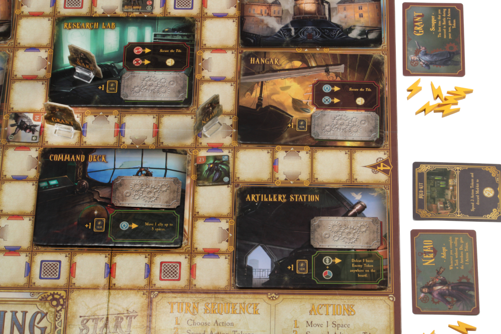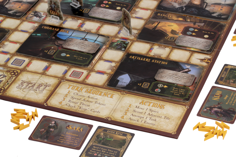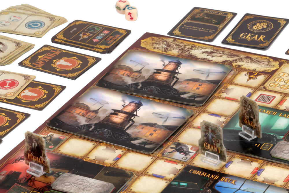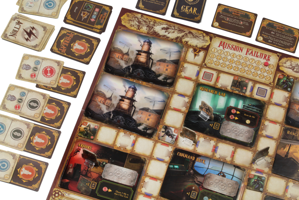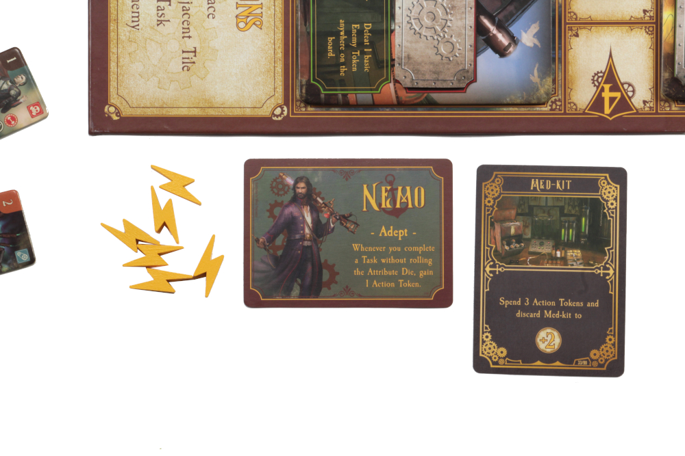 As you and your fellow players work together, you can choose to explore one of two scenarios. The first scenario is the Undersea Grotto, where you must venture outside the Nautilus to gather supplies while avoiding sea hydras, deep sea scavengers, and the mechanical Kraken. The second scenario is the majestic City in the Sky, where you must thwart Robur the Conqueror and his army of foot soldiers, war dogs, and steam-powered creations. Special action cards and customized dice allow you to attempt dangerous tasks and overcome powerful enemies in order to save the world.