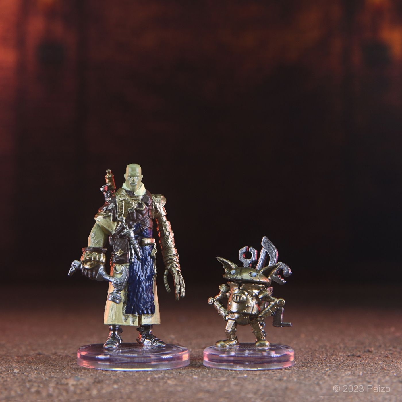 The iconic characters in this set include the half-orc inventor Droven and his clockwork companion Whirp, the human thaumaturge Mios, the dwarf gunslinger Nhalmika, the elf psychic Thaleon, and the human kineticist Yoon.