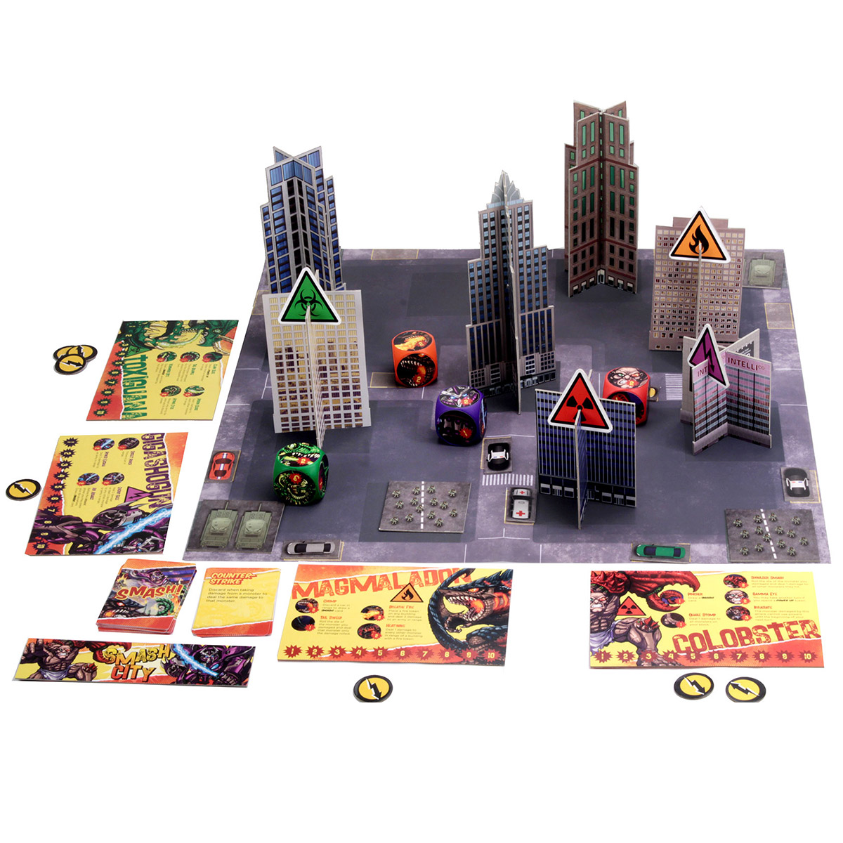 Smash City is the action-packed game of Kaiju combat! Toss your giant monster dice at your foes to perform devastating attacks! Crush cities and spread fire, electricity, poisonous gas and radiation! Throw cars and destroy tanks! Inflict maximum carnage like a true Kaiju!