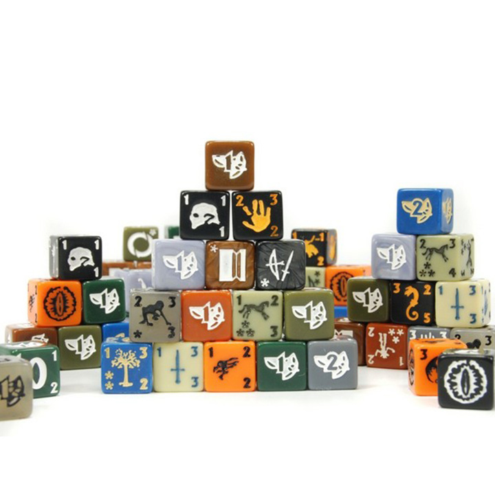 Players alternate taking turns for Sauron and his forces. Sauron’s forces are represented by three sets of “Enemies” dice. Early in the game, players will face the likes of Goblins and Trolls with The Fellowship of the Ring Enemies dice. As players progress in the game, they will encounter tougher foes such as Wargs, Mumakil and Nazgul with The Two Towers Enemies dice & The Return of the King Enemies dice.